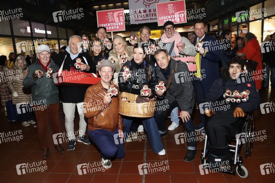 Horst Schroth, Farid Müller, Carola Veit, Oke Göttlich, Stephan A. Tölle, Doris Kunstmann, Katy Karrenbauer, Jan Sosniok, Nik Breidenbach und Ulf Ansorge beim 27. Charity Teddybären Verkauf zugunsten von Leuchtfeuer im Hauptbahnhof. Hamburg, 14.11.2024
