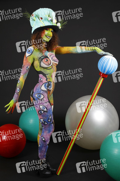 Das World Bodypaiting Festival 2020 fand aufgrund der Corona-Pandemie online statt. Unter dem vorgegebenen Motto 'Psychedelic Circus' verwandelte BodyArt-Künstler Jörg Düsterwald sein Model Lena in einen psychedelischen Mad Hatter. Hameln, 10.07.2020