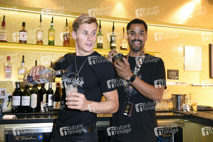 Lukas Sauer und Patrice Bouedibela kellnern im Rahmen der Pinktober Charity-Aktion zugunsten der Organisation Brustkrebs Deutschland e.V. im Hard Rock Cafe. Berlin, 27.10.2019