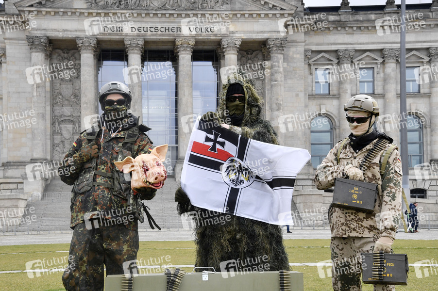 Protestaktion zur Sondersitzung des Verteidigungsausschusses des Bundestags zu den Vorfällen bei den Kommando Spezialkräften (KSK) der Bundeswehr vor dem Reichstagsgebäude. Bei der Aktion führen drei als KSK-Soldaten in voller Tarnmontur gekleidete Aktivisten vor der Kulisse des Bundestagsgebäudes die letzten Skandale der Bundeswehr-Einheit vor: Einer hält einen (künstlichen) blutverschmierten Schweinekopf in Händen, ein anderer zeigt rechtsextreme Symbolik und der dritte trägt Munitionskisten und Munition. Damit sollen die skandalträchtigen 'Partys' einiger KSK-Soldaten (bei denen reale Schweineköpfe verwendet wurden), die rechtsextremen Vorfälle in der Einheit sowie den Munitionsklau symbolisiert werden. Weiterhin wird ein Transparent mit der Aufschrift 'Kommando Spezialkräfte Auflösen' mit dem durchgestrichenen Wappen der Einheit gezeigt. Berlin, 12.04.2021
