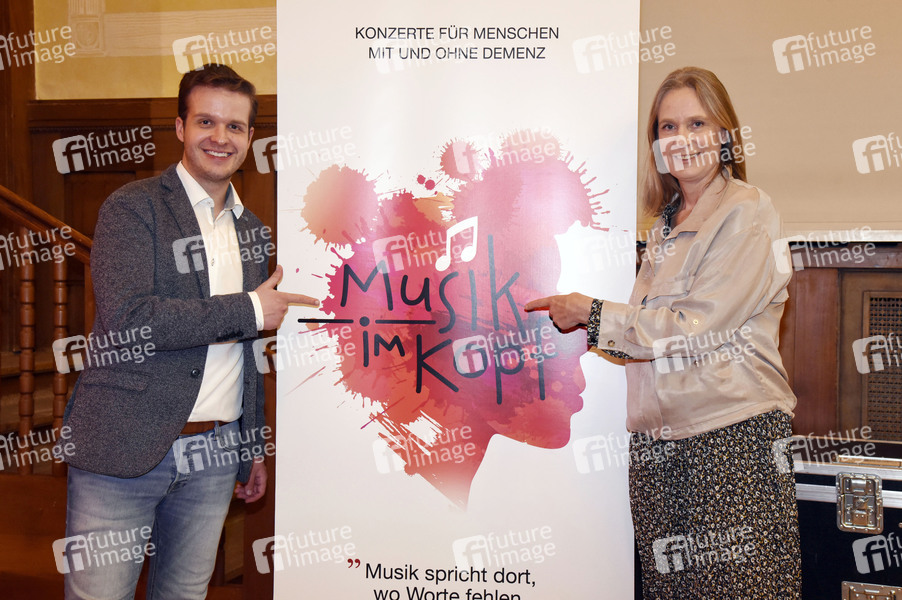 Tobias Boeck und Desiree von Bohlen von Halbach (Gründerin Desideria Care) beim Fototermin zum Programm 'Musik im Kopf' in Kooperation mit Desideria Care e. V. im Kleinen Theater. Haar, 18.04.2021