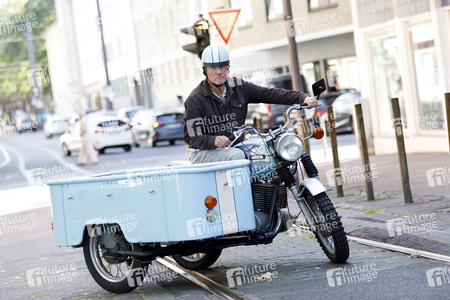 Jürgen Becker in einem Motorrad mit Beiwagen beim Fotocall zum WDR-Film 'Besuch aus dem Westen - Jürgen Becker unterwegs im Osten Deutschlands' im Mauritiussteinweg. Köln, 22.08.2019