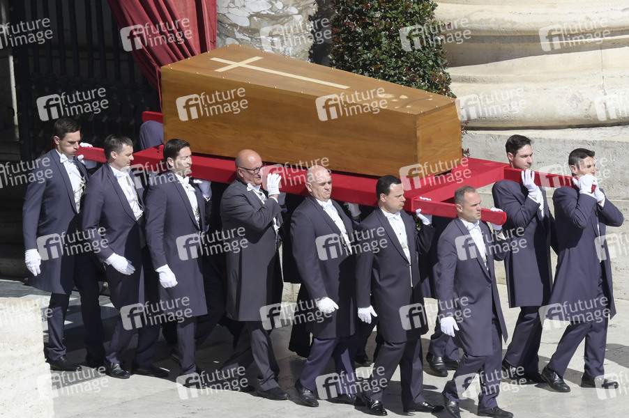 Der Sarg bei der Trauermesse für den verstorbenen Papst Franziskus auf dem Petersplatz. Vatikanstadt, 26.04.2025