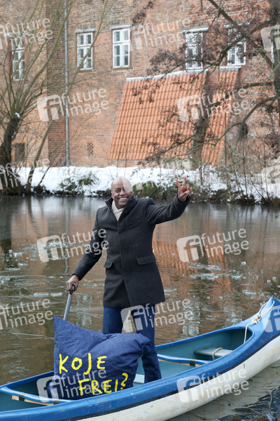Yared Dibaba paddelt auf dem Schloßteich für die Aktion 'Koje frei?' um für Unterkünfte für Teinehmer der Kirchentags zu werben. Winsen an der Luhe, 13.03.2013
