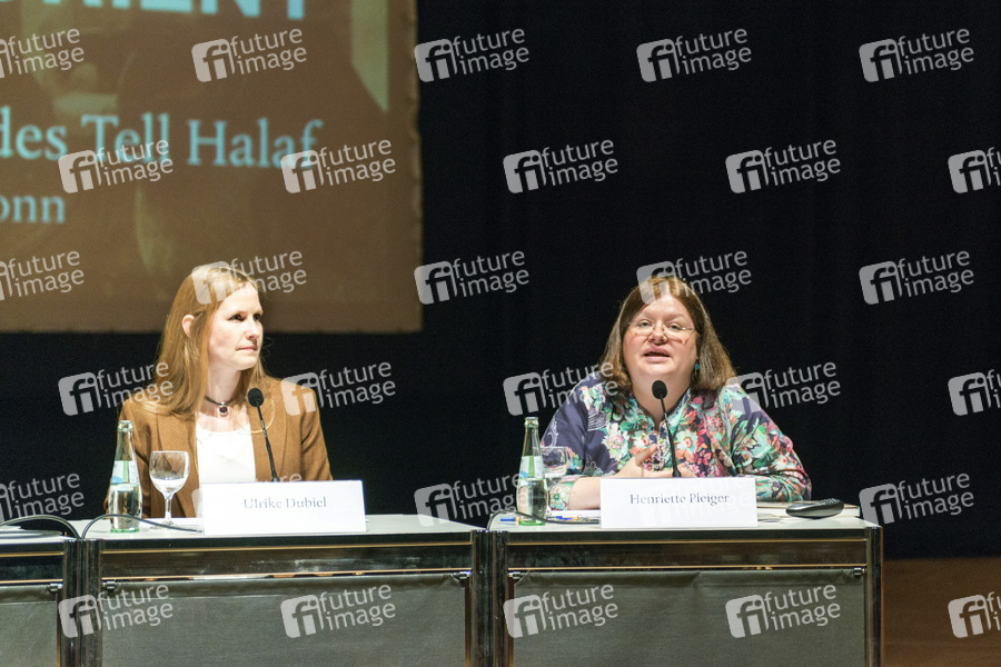 Ulrike Dubiel und Henriette Pleiger bei der Pressekonferenz zur Ausstellung 'Abenteuer Orient - Max von Oppenheim und seine Entdeckung des Tell Halaf' (1899 entdeckte Max Freiherr von Oppenheim auf dem Tell Halaf einen aramäischen Fürstensitz aus dem frühen 1. Jahrhundert v. Chr.) in der Bundeskunsthalle. Bonn, 29.04.2014