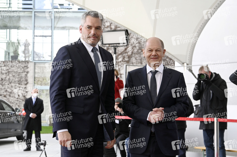 Karl Nehammer und Olaf Scholz beim Empfang des Bundeskanzlers der Republik Österreich mit militärischen Ehren im Bundeskanzleramt. Berlin, 31.03.2022