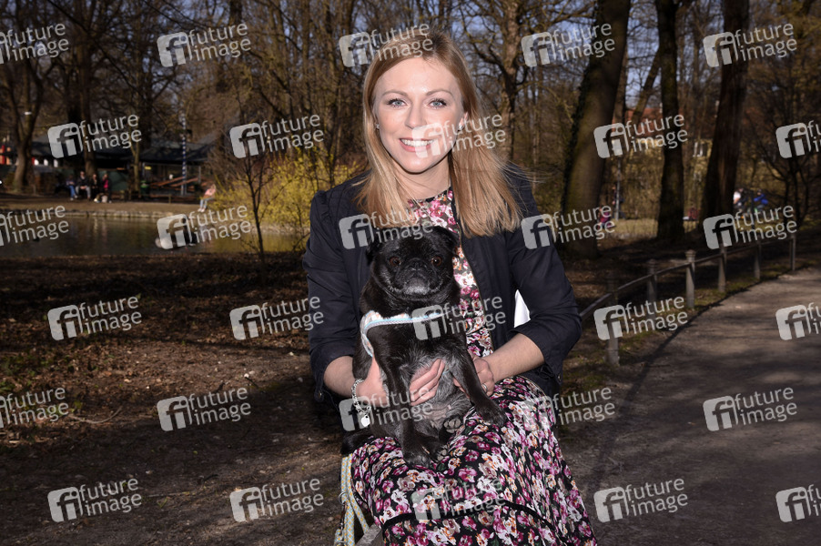 Anna Ewelina beim Spaziergang mit Hund Resi am Kleinhesseloher See im Englischen Garten. München, 28. 03.2021