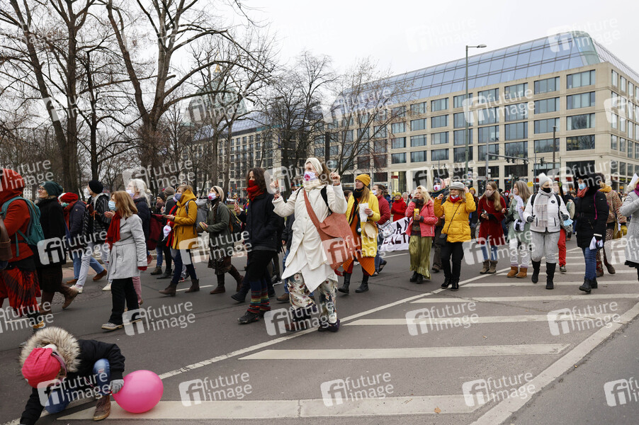 Unter dem Motto 'Gemeinsam in eine lebendige Zukunft' findet ein multikultureller Frauenmarsch vom Brandenburger Tor über das Rote Rathaus zum Gendarmenmarkt statt. Berlin, 28.02.2021