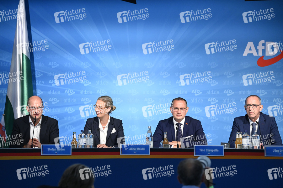 Stefan Möller, Alice Weidel, Tino Chrupalla und Jörg Urban bei der Wahlnachlese der AfD nach den Landtagswahlen in Thüringen und Sachsen in der AfD-Bundesgeschäftsstelle. Berlin, 02.09.2024