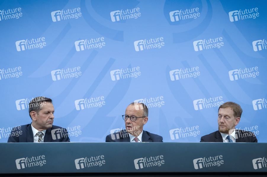Olaf Lies, Friedrich Merz und Michael Kretschmer bei der Pressekonferenz zur Konferenz der Regierungschefinnen und Regierungschefs der Länder im Bundesratsgebäude. Berlin, 18.06.2025