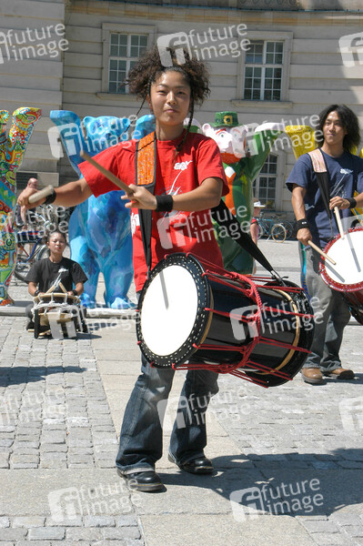 Photocall mit Yamato, den Trommlen aus Japan auf dem Berliner Bebelplatz im Kreis der Buddy Bären