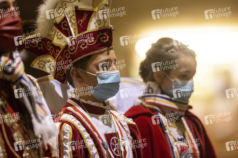 Der karnevalistische Gottesdienst fand unter 3G-Bestimmungen in der Severikirche auf dem Erfurter Domberg statt. Pfarrer Michael Neudert, gab den Karnevalisten, einschließlich den Prinzenpaaren Christian II. und Verena II. und den Kindern Luca I. und Noelanie I. den Segen für die anstehende Kampagne. (Personen im Bild: v.l. Kinderprinzenpaar Luca I. und Noelani I.). Erfurt, 16.01.2022