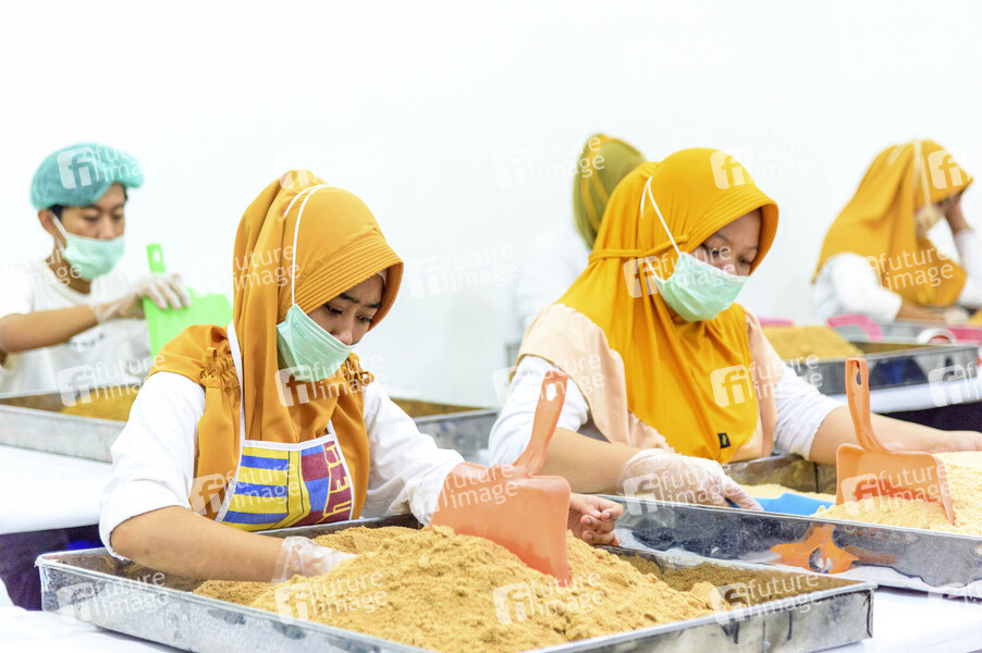 Mitarbeiter der Firma PT Mega Inovasi Organik in der Kokosblütenzuckerproduktion tragen Mundschutz und führen alle strengen Hygiene-Maßnahmen durch, besonders während der Coronakrise. Yogyakarta, 19.04.2020