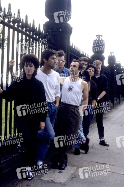 Terry Sharpe, Pat Gribben, Eileen Gribben, Gerard 'Spud' Murphy, Paul Crowder, Jonathan Whitehead und Tony Ayre von The Adventures bei einem Photoshooting. London, 15.07.1985