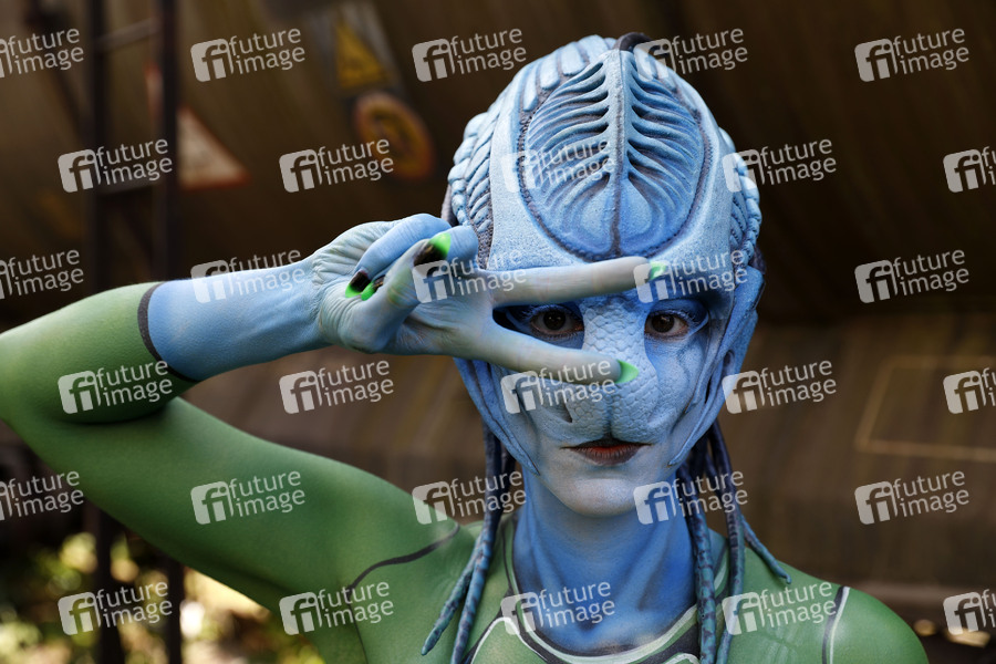 Cosplay, Cosplayer, Bodypainting, Body-Painting, Make-up, Latexappliaktionen, Maskenbildnerei, Körperkunst, Körperfarben, Projekt Farbkörper, Farbe, Bemalung, Kunst, Malerei, Außerirdische, Besucher, Invasion, Science Fiction, nackt, Erkundung, Bahn, Gleise, Bahngleise, Waggons, Bahnwaggon, Güterbahnhof, body painting, body art, project color body, colors, nude, naked, alien, aliens, tracks, railroad tracks, wagons, railway wagons, freight station, vistor, visitors