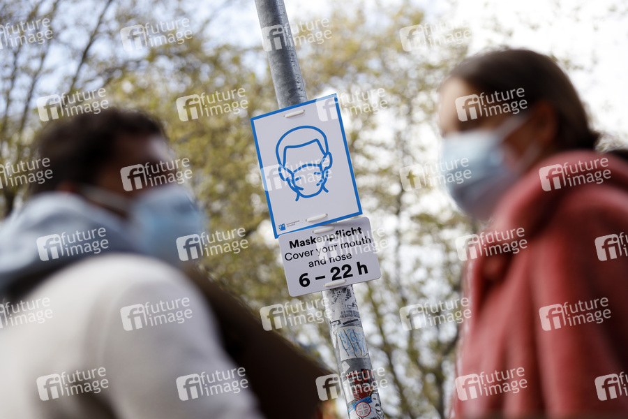 Ein Schild weist Teilnehmer einer Demo auf die Maskenpflicht vor dem Düsseldorfer Hauptbahnhof in der Zeit von 6 bis 22 Uhr hin. (Themenbild, Symbolbild) Düsseldorf, 01.05.2021