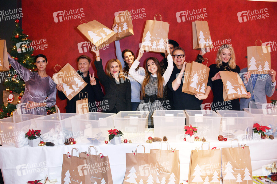 Zoe Helali , Dawid Tomaszewski, Sibel Brozat, Katrin Wrobel, Kassandra Kaven, Maximilian Seitz, Rolf Scheider, Victoria Jancke und Günther Krabbenhöft bei der Veranstaltung 'Strassenfeger x Maximilian Seitz - Weihnachtsgeschenke einpacken für Obdachlose und Bedürftige' im Hotel Q!. Berlin, 08.12.2021