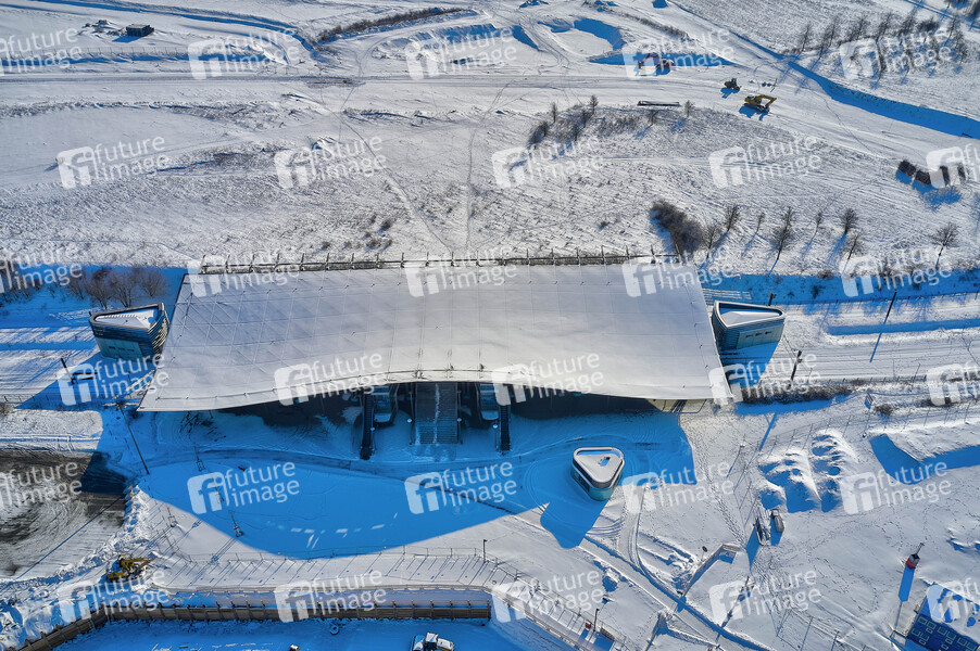 Luftbild von der Expo Ost Stadtbahnhaltestelle auf dem EXPO 2000 Areal und dem Messegelände im Winter. Hannover, 11.02.2021