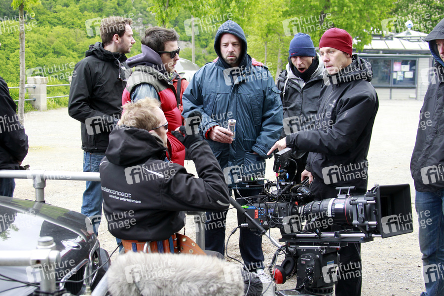 Bei den Dreharbeiten zum Kinofilm 'Schlussmacher' an der Edertalsperre am Edersee. Produzent Dan Maag (mit Kapuze) und Stuntregisseur Carl Stück (mit roter Mütze) geben Anweisungen.