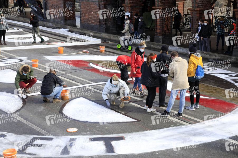 Am Freitag finden mehrere Demonstrationen zum globalen Klimastreik von Fridays for Future in Berlin statt. An der Oberbaumbrücke bemalen Aktivisten die Straße zum Thema 'Another World is possible'. Berlin, 19.03.2021