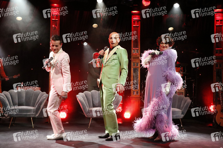 Die Geschwister Pfister Christoph Marti (Ursli Pfister) und Tobias Bonn (Toni Pfister) mit Andreja Schneider bei der Präsentation des neuen Musicals 'Relaxez-Vous!' in der Bar Jeder Vernunft. Berlin, 28.11.2022