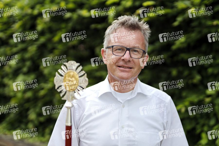 Klaus Koltermann bei einer Kundgebung auf dem Börsenplatz, bei der Gläubige aus dem Erzbistum Köln und Aktivisten der Bewegung Maria 2.0 das Verhalten der Kirche und Erzbischof Rainer Maria Kardinal Woelki bei der Aufarbeitung des Missbrauchskandal kritisieren. Am Nachmittag trifft auch eine Pilgergruppe von Pfarrer Klaus Koltermann aus Dormagen Nievenheim mit 60 Christen nach 40 Km Fußmarsch unter dme Motto 'Aufbruch nach Köln' auf dem Börsenplatz ein. Koltermann hat sich als einziger Pfarrer in Deutschland für den Rücktritt von Kardinal Woelki ausgesprochen. Köln, 12.06.2021