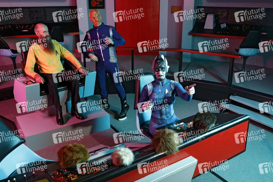 GEEK ART - Bodypainting meets SciFi, Fantasy and more: 'Star Trek Discovery' Photoshooting mit Model Barbara Wegener als Airiam, Enrico Lein als Saru und Martin Netter als Captain auf der Brücke vom Raumschiff Enterprise im Filmwelt Center. Bad Münder, 18.04.2019 - Ein Projekt des Fotografen Tschiponnique Skupin und des Bodypainters und Transformakers Enrico Lein
