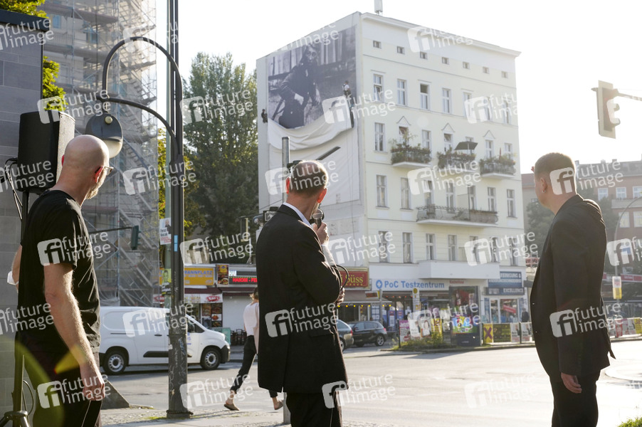 Moritz van Dülmen, Axel Klausmeier und Klaus Lederer bei der Installation eines Großfotos zum 60. Jahrestag des Mauerbaus von Kulturprojekte Berlin und der Stiftung Berliner Mauer am Hermannplatz. Berlin, 13.08.2021