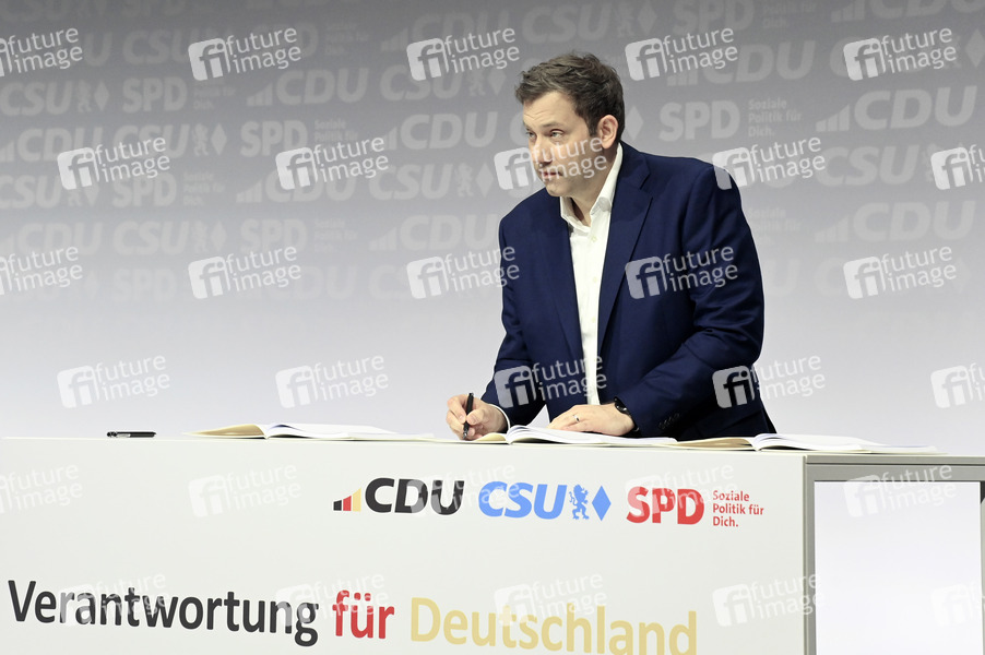 Lars Klingbeil bei der Unterzeichnung des Koalitionsvertrages zwischen CDU, CSU und SPD im Gasometer Schöneberg. Berlin, 05.05.2025
