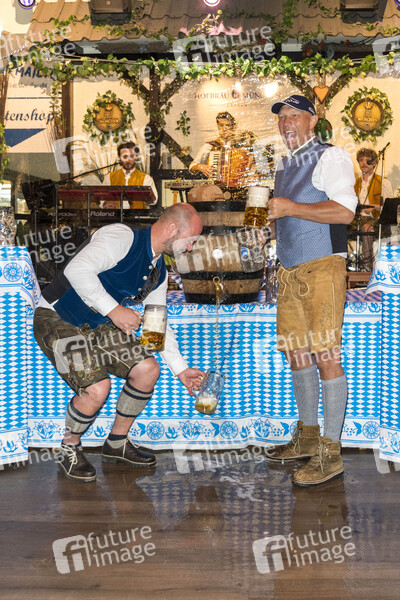 Björn Schwarz und Axel Schulz beim Fassanstich bei der 9. Hofbräu Berlin Wiesn im Hofbräu Wirtshaus Berlin. Berlin, 19.09.2020