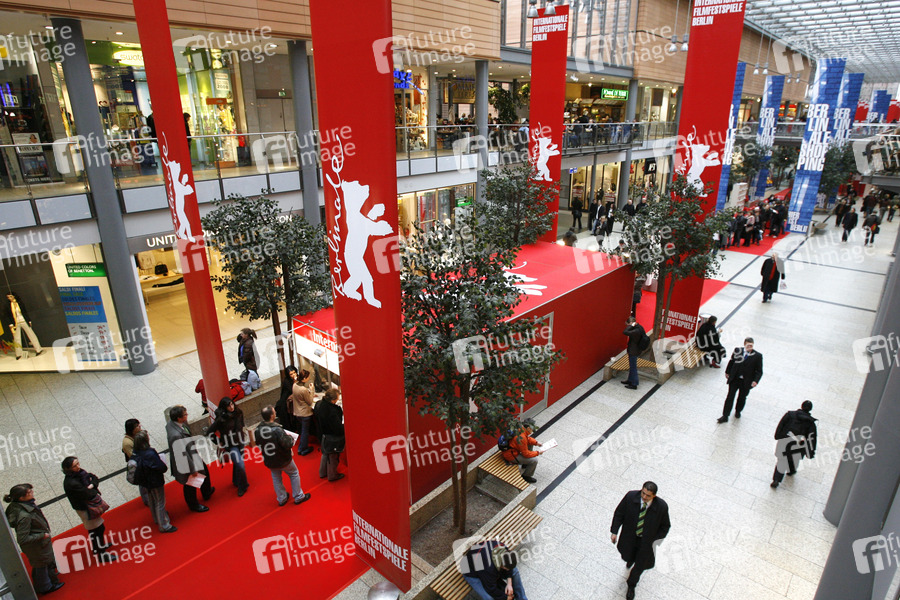 Film Fans, Kinobesucher, Berlinale Besucher, Berlinale Banner, Fahnen, Potsdamer Platz Arkaden