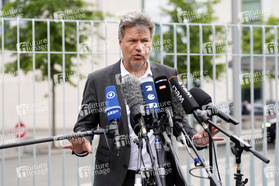 Robert Habeck beim Pressestatement zum Kabinettbeschluss zum Wasserstoffbeschleunigungsgesetz und zur Carbon Management Strategie vor dem Bundeskanzleramt. Berlin, 29.05.2024