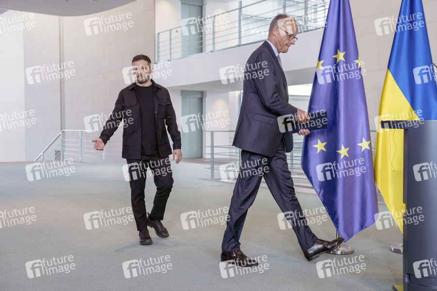 Wolodymyr Selenskyj und Friedrich Merz beim Pressestatement zum virtuellen Treffen zur Ukraine im Bundeskanzleramt. Berlin, 13.08.2025