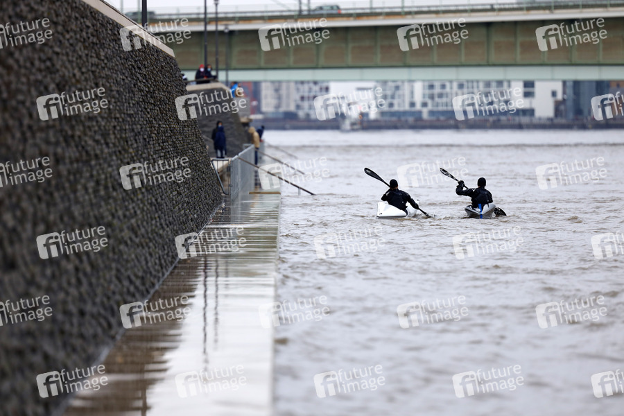 Der Kölner Rheinpegel steigt und steigt. Am Sonntagabend wurde in Köln ein Hochwasser von 7,50 Meter gemessen, der Normalwasserstand liegt sonst bei 3,21 Meter. Die Schifffahrt ist bereits eingeschränkt. Am Kölner Rheinufer werden immer mehr Barrikaden errichtet und Bereiche abgesperrt. Das Wasser klettert auf Promenaden und überspült Treppen und Fähranleger. Köln, 31.01.2021