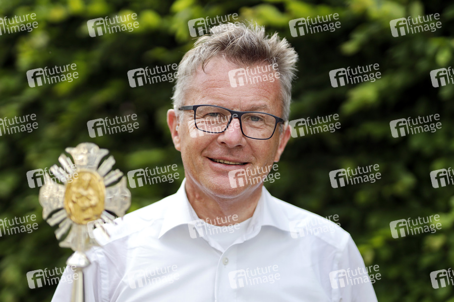 Klaus Koltermann bei einer Kundgebung auf dem Börsenplatz, bei der Gläubige aus dem Erzbistum Köln und Aktivisten der Bewegung Maria 2.0 das Verhalten der Kirche und Erzbischof Rainer Maria Kardinal Woelki bei der Aufarbeitung des Missbrauchskandal kritisieren. Am Nachmittag trifft auch eine Pilgergruppe von Pfarrer Klaus Koltermann aus Dormagen Nievenheim mit 60 Christen nach 40 Km Fußmarsch unter dme Motto 'Aufbruch nach Köln' auf dem Börsenplatz ein. Koltermann hat sich als einziger Pfarrer in Deutschland für den Rücktritt von Kardinal Woelki ausgesprochen. Köln, 12.06.2021