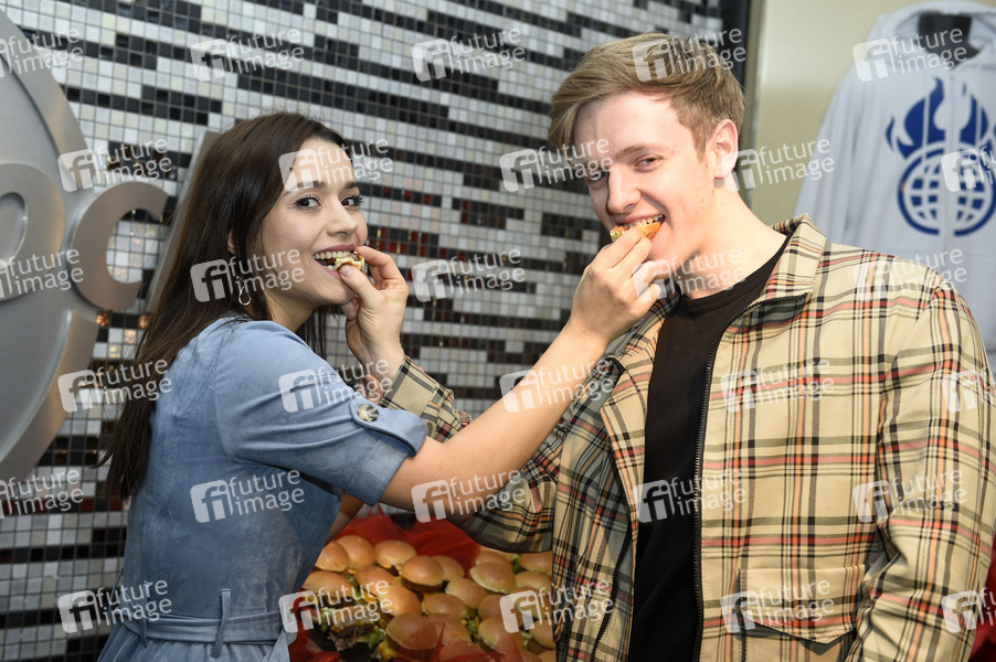 Timur Bartels mit Freundin Michelle Math beim Probieren, Anschneiden und Verteilen der Valentinstag-Burger im Hard Rock Cafe. Berlin, 13.02.2020