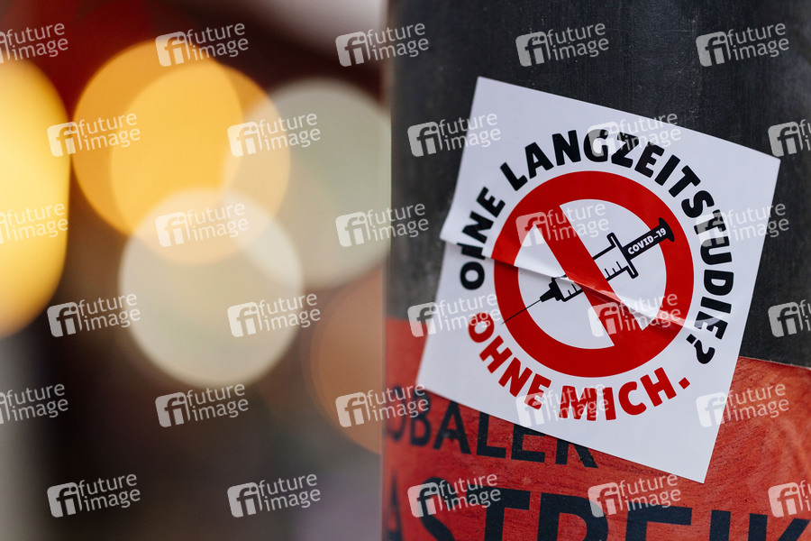 Ein Sticker mit der Aufschrift 'Ohne Langzeitstudie? Ohne mich.' weist auf Vorbehalte gegenüber Impfmitteln hin, die eine Notfallzulassung erhielten und deren Landzeitschäden nicht erforscht sind. (Themenbild, Symbolbild) Köln, 28.01.2021