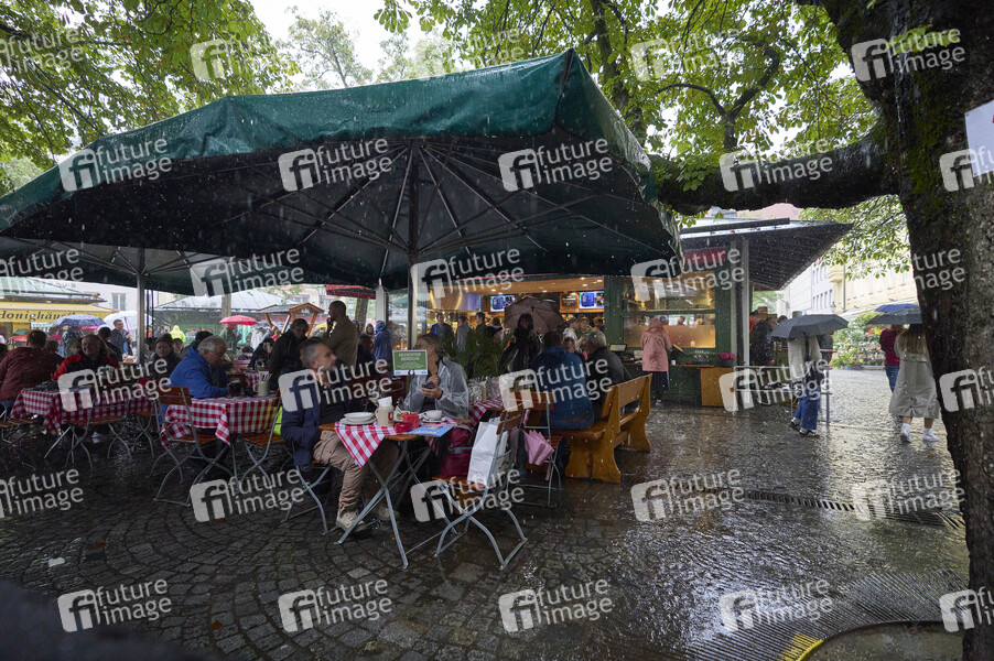 Der Biergarten am Viktualienmarkt in München im Starkregen. Das Wetter in München ist geprägt von Regenschauern und kühlen Temperaturen. Laut Vorhersage eines Meteorologen vom Deutschen Wetterdienst könnte das wechselhafte Wetter noch eine Weile anhalten. München, 02.08.2025