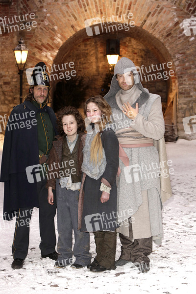 Oliver Korittke, Maximilian Ehrenreich, Lea Mueller und Joerg Hartmann beim Fototermin am Set des Fernsehfilms 'Das Mädchen mit den Schwefelhölzern' aus der ARD-Märchenreihe 'Sechs auf einen Streich' in der Zitadelle Spandau. Berlin, 18.03.2013