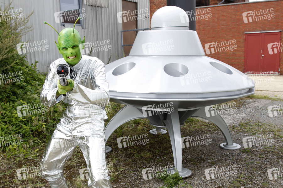 GEEK ART - Bodypainting and Transfomaking: UFO Photoshooting mit Paul Skupin als Außerirdischer nach einer Landung auf einem Industriegelände auf dem Planeten Erde in Bakede. - Ein Projekt des Fotografen Tschiponnique Skupin und des Bodypainters und Transformakers Enrico Lein