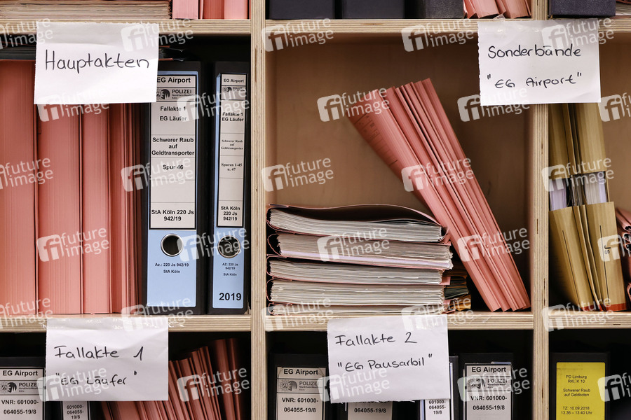 Fallakten im Prozess um u.a. den Angeklagten Thomas Drach vor dem Kölner Landgericht. Der 61-jährige frühere Reemtsma-Entführer soll vier Geldtransporter in Köln, Frankfurt am Main und Limburg überfallen haben. Die Anklage lautet unter anderem auf versuchten Mord und besonders schweren Raub. Der Prozess findet unter aufwendigen Sicherheitsvorkehrungen statt. Köln, 07.02.2022
