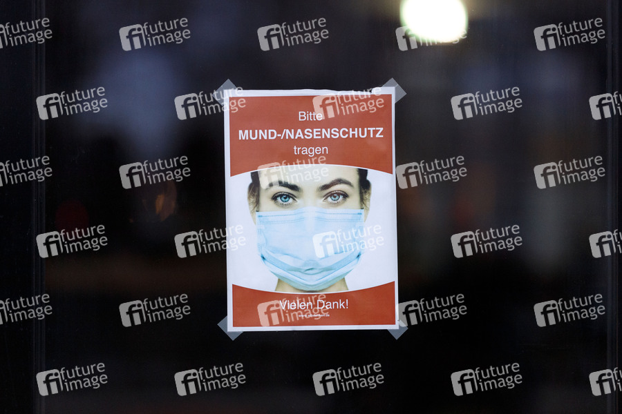 Wegen der Corona-Pandemie haben sich Bund und Länder auf eine Verlängerung des Lockdown bis Mitte Februar geeinigt. Somit bleiben beispielsweise Restaurants, Kulturbetriebe und viele Geschäfte im Einzelhandel geschlossen. In Geschäften und dem Nahverkehr besteht zudem ab Montag eine Pflicht zu medizinischen Masken (FFP2-Masken oder OP-Masken). Im Einzelhandel drohen zudem tausende Insolvenzen, weil vom Staat versprochene Finanzhilfen immer noch nicht rechtzeitig ankommen. Im Bild ein Hinweisschild, das Kunden zum Tragen einer Mund-Nasen-Bedeckung bittet an einem Laden in der Kölner Altstadt. (Themenbild, Symbolbild) Köln, 23.01.2021