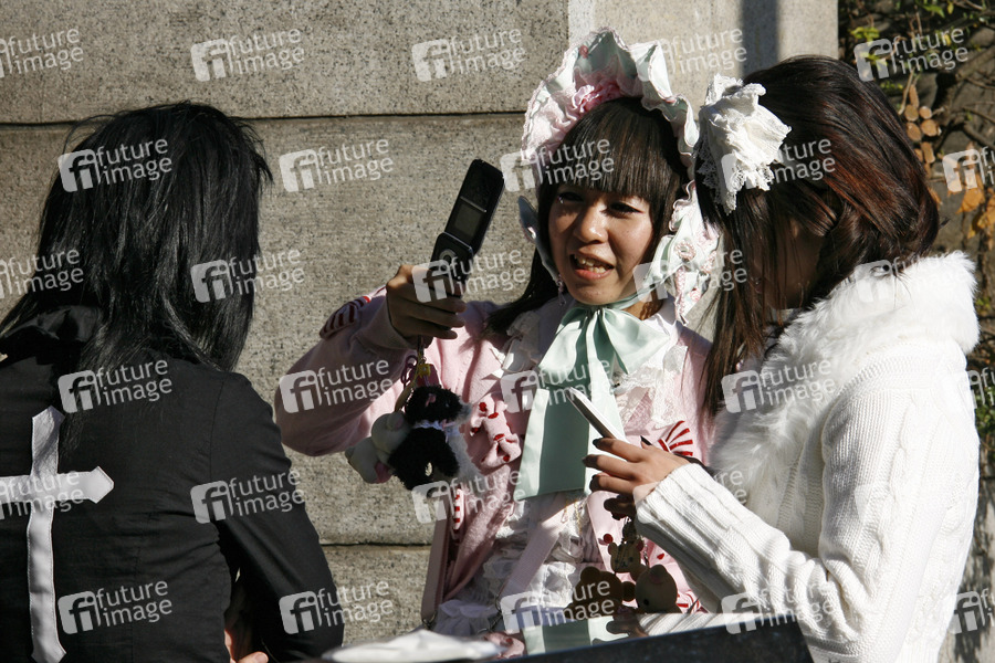 Cosplay ist die japanische Abkürzung des englischen Begriffs costume play und bezeichnet einen japanischen Trend der im Laufe der 1990er-Jahre mit dem Manga- und Anime-Boom aus Japan in die USA und nach Europa kam, beim Cosplay stellt der Teilnehmer seine Lieblingsfigur durch Kostüm und Verhalten möglichst originalgetreu dar, Jugendliche in Tokio, Teenager, Cosplayer, Gothic Lolitas