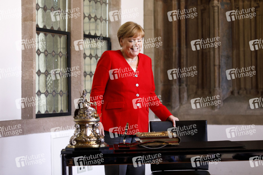 Angela Merkel trägt sich ins Goldene Buch der Stadt Köln ein im Hansesaal des historischen Rathauses. Köln, 14.06.2019