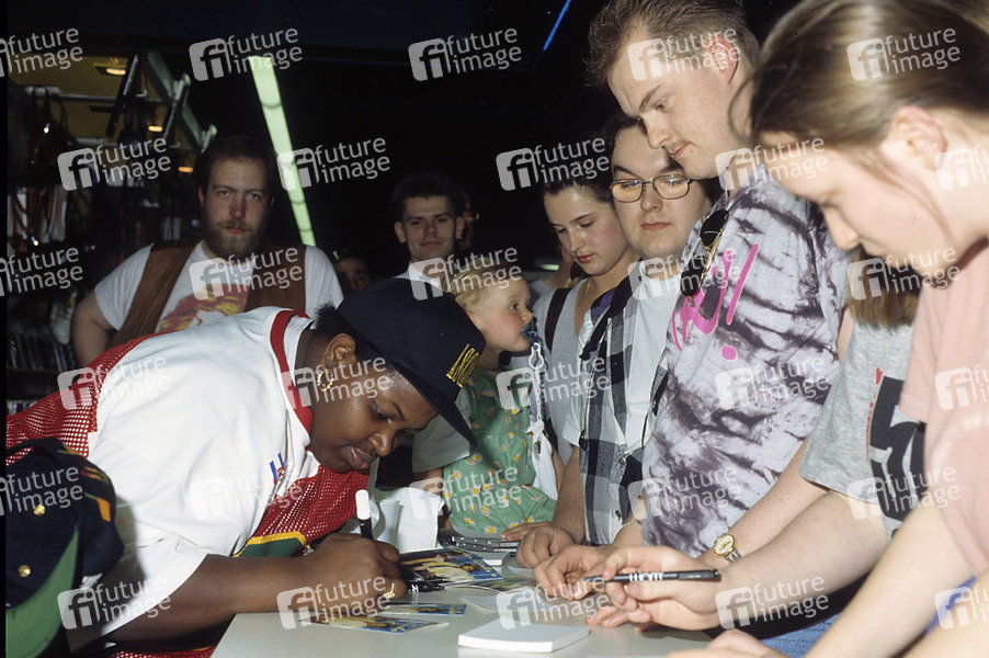 Dynelle Rhodes von The Weather Girls bei einem Showcase mit Autogrammstunde zu ihrem Album 'Double Tons of Fun' im Plattenladen WOM. Hannover, 25.05.1994