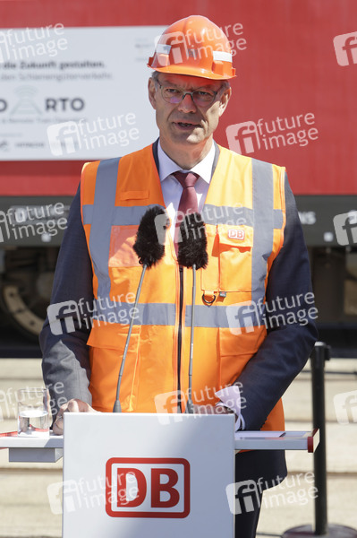 Patrick Schnieder bei der Vorstellung der ersten Güterzuglokomotive, die für den automatisierten Streckenbetrieb umgerüstet wurde im DB Cargo-Werk Köln-Gremberg. Köln, 04.07.2025