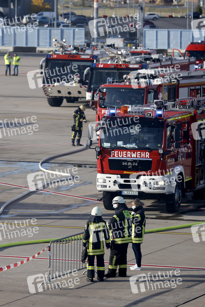 Einsatzkräftei der gemeinsamen ICAO-Notfallübung der Werkfeuerwehr, der Feuerwehr Köln, THW, Landespolizei, Bundespolizei und Bundeswehr am Köln Bonn Airport. Im Rahmen der Übung wird die Kollision eines Flugzeugs mit einem Passagierbus und einer Abfertigungshalle simuliert. Einsatzkräfte retten Verletzte aus dem in Brand geratenen Flugzeug. Köln, 06.11.2021