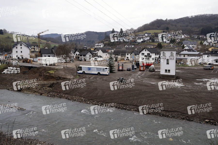 Sechs Monate nach der Jahrhundertflut im Ahrtal ist der Wiederaufbau in der damals schwer getroffenen Ortsgemeinde Schuld weit vorangeschritten. Immer noch sind manche Häuser aber zerstört und es führen stellenweise provisorische Brücken über die Ahr. Schuld, 12.01.2022