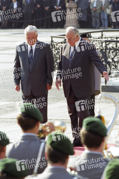 Poilitker, 1991-1999 der erste Präsident Russlands, 1982-1998 der sechste Bundeskanzler der Bundesrepublik Deutschland, Politik, Außenpolitk, Staatsbesuch, Verabschiedung, Besatzungszeit, Besatzungsmacht, Siegermacht, Armee, Soldaten, Uniform, Parade, Militär, Berlin-Brigade, Streitkräfte, Alliierte, Kbsw, Militärparade, Abrüstung, Zeitgeschichte, Zeitgeschehen