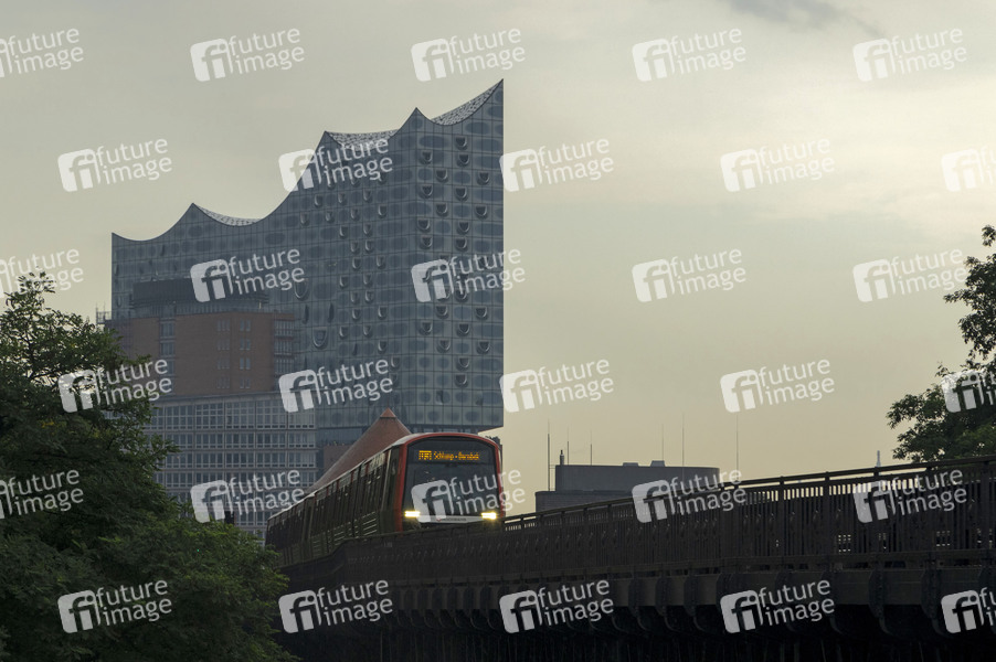 Starke Regenfälle und Gewitter sorgen diesen Sommer vermehrt für Unwetterwarnung: Elbphilharmonie und U-Bahn der Linie U3 im Regen an den Landungsbrücken im Hafen. Hamburg, 14.08.2024